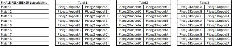 De wedstrijden worden gelijktijdig gespeeld op drie tafels, waarbij de drie ploegen tegelijkertijd in actie komen.